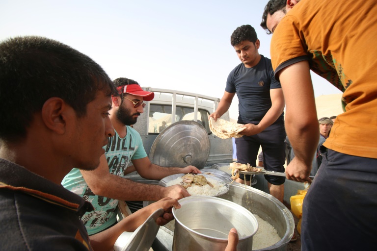 A Khaldiya, un autre camp sur les rives du lac Habbaniyah, une ONG organise une distribution de nourriture qui, pour certains déplacés, est la première depuis leur fuite.