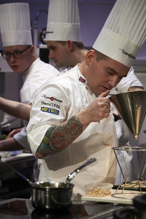 Un brin anxieux, l'Australien Daniel Arnold, 29 ans, fouette une sauce avant de la goûter. Pour son assiette végétale, celui qui officie depuis cinq ans en France chez Serge Vieira, deux étoiles au Michelin dans le Cantal, a concocté un "plat de légumes représentant un feu de brousse avec les couleurs et le goût fumé", explique son patron, Bocuse d'Or 2005.