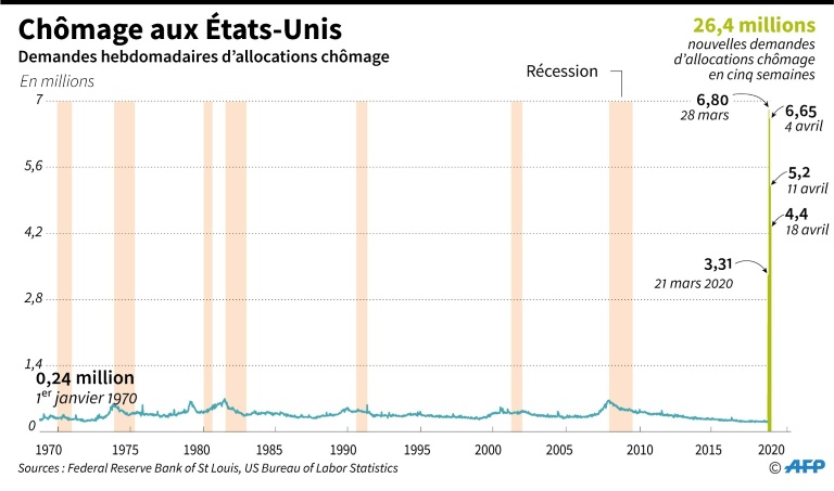 Or, depuis le mois de mars, ce n'est plus la croissance américaine qui grossit, mais le nombre de chômeurs, qui augmente à des niveaux jamais vus. En cinq semaines, 26,453 millions de personnes ont perdu leur emploi ou vu leur activité réduite à néant, selon les chiffres publiés jeudi par le département du Travail. La semaine passée, 4,42 millions de personnes ont demandé une allocation chômage pour la première fois.
