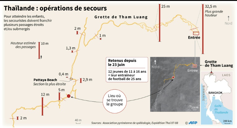 Un ancien plongeur de la marine thaïlandaise a péri vendredi lors d'une opération de ravitaillement des enfants, ce qui a semé le doute quant à la faisabilité d'une extraction sans risque du groupe. Une bonne partie des enfants, âgés de 11 à 16 ans, ne savent pas nager, et aucun n'a fait de plongée, ce qui complique d'autant plus les opérations.