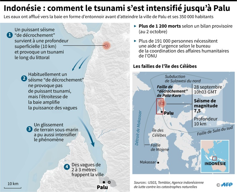Dans la région de Palu, localité de 350.000 habitants sur la côte occidentale des Célèbes, des bâtiments ont été rasés. Les voies d'accès sont très endommagées si bien que l'aide arrive au compte-goutte. La ville a été le théâtre de pillages.