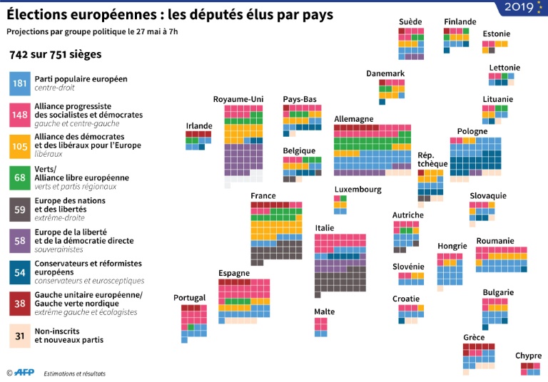 Selon des estimations à confirmer, la Ligue de Matteo Salvini pourrait devenir le parti national ayant le plus de membres au Parlement européen, à moins que cela ne soit le Parti du Brexit du Britannique Nigel Farage. Les résultats définitifs le diront. L'ENL, où siègent actuellement des députés RN et de la Ligue, passerait de 36 membres à une soixantaine dans le nouveau Parlement, selon des projections. Le groupe populiste EFDD gagnerait lui une douzaine de sièges (pour atteindre 56 membres).