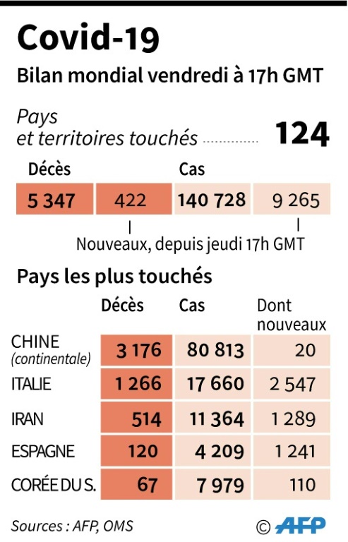 Mais l'épidémie, qui a déjà fait plus de 5.300 morts dans le monde, progresse quasiment partout ailleurs. Son pic est "impossible" à prévoir, a averti l'OMS. La pandémie a contaminé plus de 141.000 personnes dans plus de 124 pays et territoires.
