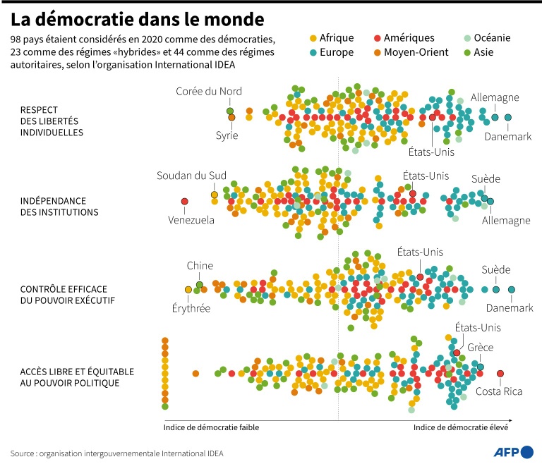 "La détérioration visible de la démocratie aux États-Unis, comme en témoignent la tendance croissante à contester des résultats électoraux crédibles, les efforts pour supprimer la participation et la polarisation galopante (...) est l'une des évolutions les plus préoccupantes concernant la démocratie à l'échelle mondiale", a affirmé à l'AFP le secrétaire général d'International IDEA, Kevin Casas-Zamora.
