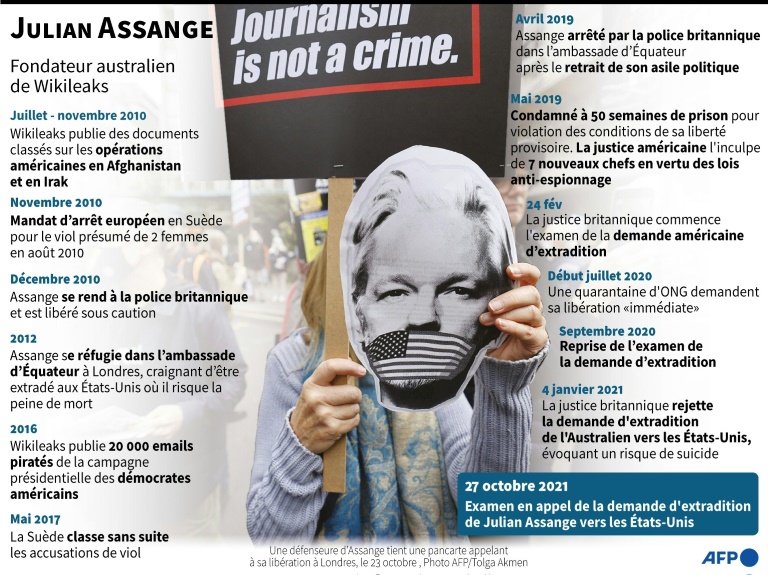 Julian Assange, soutenu par nombre d'organisations de défense de la liberté de la presse, est poursuivi pour avoir diffusé, à partir de 2010, plus de 700.000 documents classifiés sur les activités militaires et diplomatiques américaines, notamment en Irak et en Afghanistan.