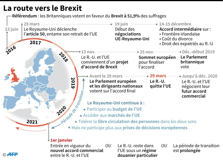 L'UE et le Royaume-Uni ont mis 17 mois à s'entendre sur le "traité de retrait" du Royaume-Uni et la "déclaration politique" qui fixe le cadre de leurs relations post-Brexit, notamment sur le plan commercial.
