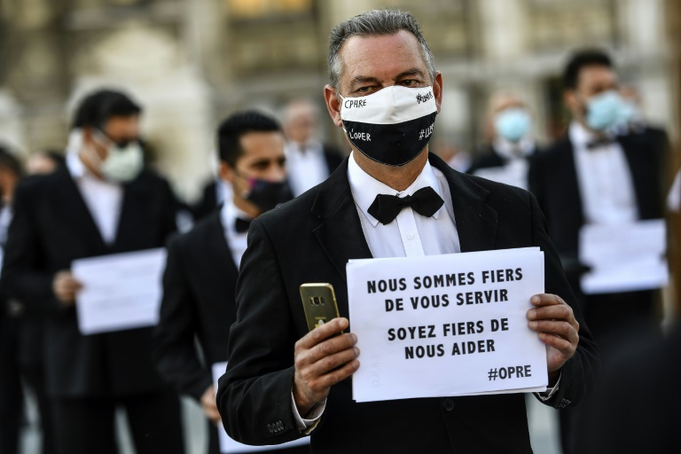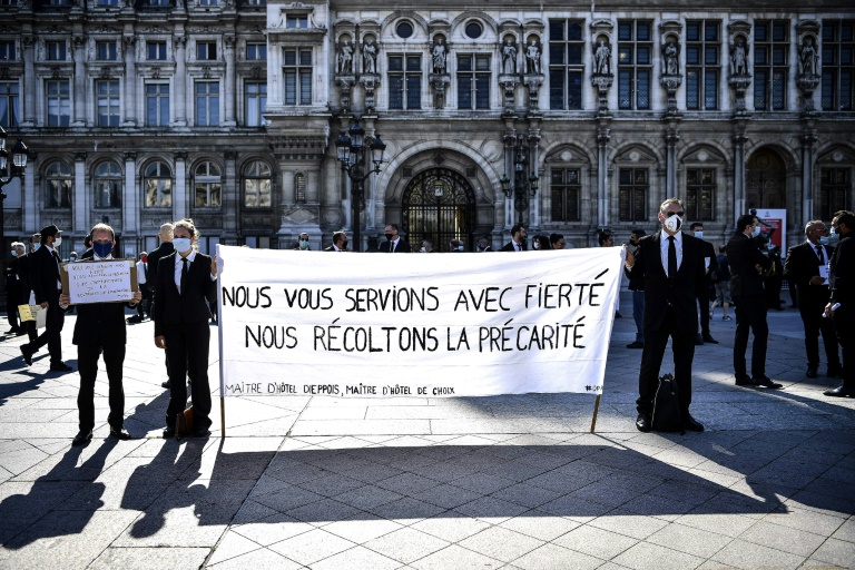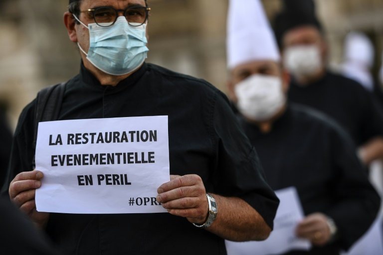 Toques blanches et n?uds papillon, les cuisiniers et maîtres d'hôtel de l'événementiel à l'arrêt du fait de l'épidémie de Covid-19 ont manifesté mercredi à Paris, Cannes et Bordeaux pour la prolongation de leurs droits au chômage et la prise en compte de leur statut d'intermittents.