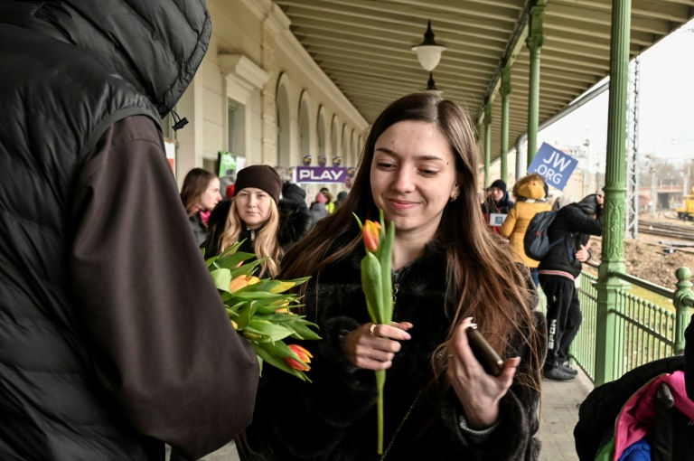 Un geste d'attention accueilli avec un grand sourire par Lilia Kysil, étudiante de 22 ans arrivée de Kiev. "C'est la première fois que j'ai l'impression de vivre une journée spéciale" depuis l'invasion de l'Ukraine par les forces russes le 24 février, a-t-elle confié, une tulipe à la main.