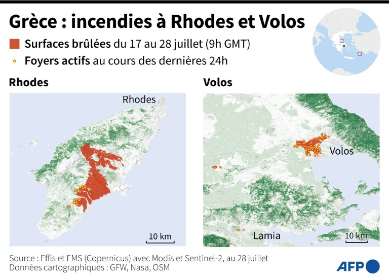 Les principaux se sont déclarés il y a plus d'une semaine sur les îles de Rhodes, théâtre le week-end dernier d'une opération massive d'évacuation de plus de 30.000 touristes, de Corfou et d'Eubée, puis dans le centre de la Grèce, où le feu a pris mercredi dans la région de Volos, sur la côte est.
