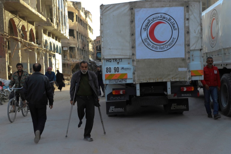 C'est dans cette grande ville qu'un convoi humanitaire d'une quarantaine de camions a pu entrer lundi, le premier à atteindre le secteur rebelle depuis le début, le 18 février, de l'offensive meurtrière des forces du régime, secondées par leur allié russe.