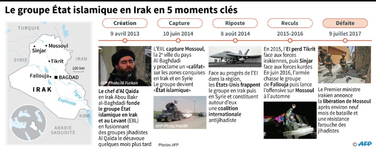 - 9 juillet 2017: Le gouvernement annonce la "libération" de Mossoul à l'issue de près de neuf mois d'une offensive menée par 30.000 membres des forces fédérales --armée, police, contre-terrorisme-- soutenus par les frappes de la coalition.