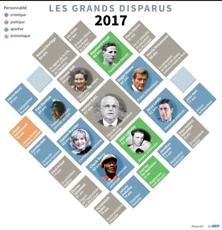 Le musicien américain Chuck Berry, l'ex-chancelier allemand Helmut Kohl, l'acteur britannique Roger Moore figurent parmi les grandes personnalités disparues dans le monde en 2017.