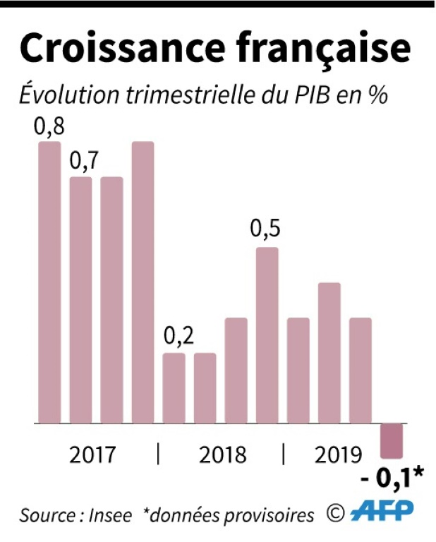 Les grèves contre la réforme des retraites ont fait reculer l'économie française en fin d'année, qui affiche un ralentissement plus fort que prévu sur l'ensemble de 2019, même si la France résiste au contexte international défavorable.