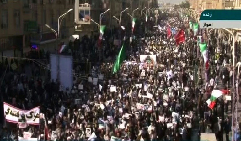 Munis de banderoles dénonçant les "fauteurs de troubles", les manifestants reprenaient des slogans en faveur du guide suprême, l'ayatollah Ali Khamenei, mais aussi "mort à l'Amérique" ou "mort à Israël", selon des images diffusées par la télévision d'Etat. Cette TV a montré des images en direct de manifestations massives dans les villes d'Ahvaz (sud-ouest), Arak (centre), Ilam (ouest), Gorgan (nord), ou encore Kermanshah (ouest).