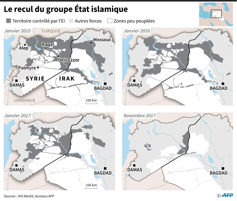 Après une montée en puissance fulgurante en 2014 et la conquête de vastes territoires en Syrie et en Irak, l'EI assiste aujourd'hui à l'effondrement de son "califat": dans ces deux pays, il a perdu toutes les villes autrefois sous son contrôle.