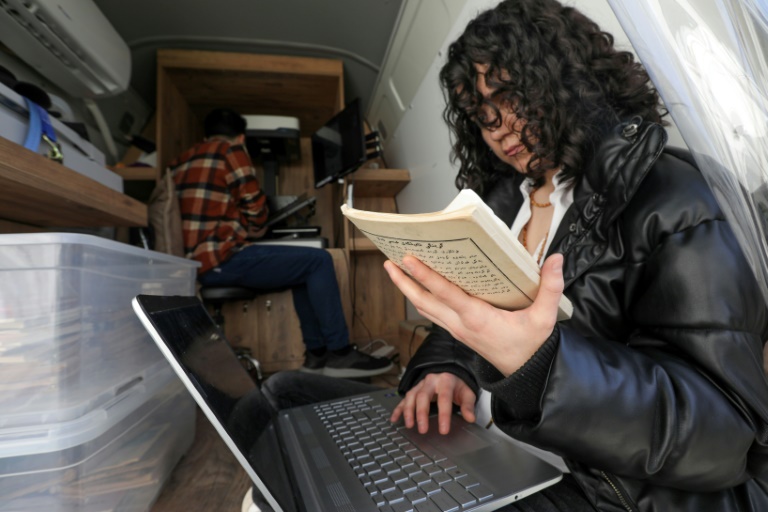 A l'arrière d'une camionnette, Rebin Pishtiwan scanne soigneusement une à une les pages jaunies d'un livre ancien et usé datant de plusieurs décennies, dans le cadre de sa mission de numérisation d'ouvrages et manuscrits kurdes anciens.