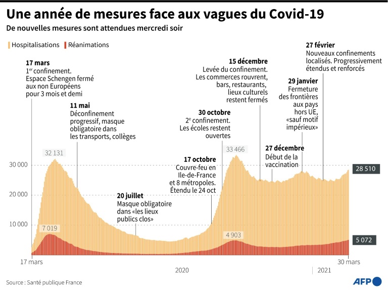 Établissements scolaires fermés, circulation limitée et commerces non essentiels fermés dans tout le pays à partir de lundi: le Parlement débat jeudi du durcissement des restrictions annoncé par le président Emmanuel Macron, qui a reconnu des "erreurs" dans la gestion de l'épidémie depuis un an.