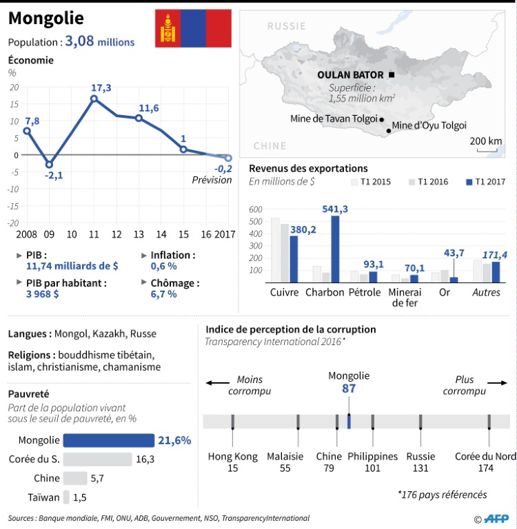 Les scandales ont volé la vedette aux problèmes économiques: la Mongolie, 3 millions d'habitants, a subi de plein fouet ces dernières années la chute des cours du cuivre, son principal poste d'exportation, et du ralentissement de la croissance chez son grand voisin chinois.