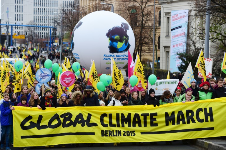 A Berlin, ils Ă©taient entre 12.000 et 17.000 Ă marcher sous la pluie jusqu?Ă la Porte de Brandebourg, oĂč un grand globe terrestre gonflable avec, au sommet, le visage de la chanceliĂšre Angela Merkel, se dĂ©coupait dans une imposante fumĂ©e noire.