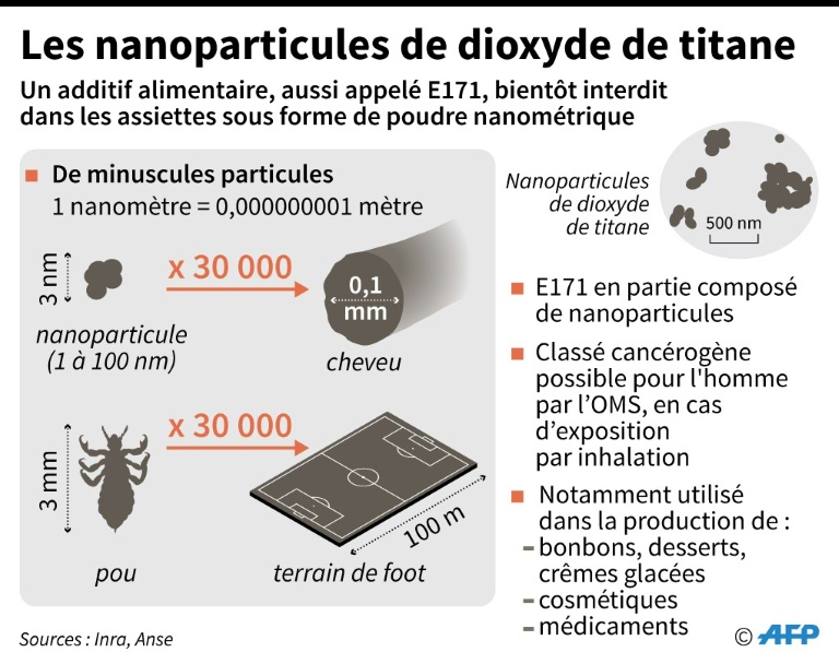 Le dioxyde de titane utilisé dans les médicaments a "pour seule utilité de colorer ou d?opacifier le pelliculage des comprimés et gélules", souligne-t-elle, assurant que 4.000 médicaments en contiendraient (Doliprane, Dafalgan, Spasfon?). Les associations de consommateurs accusent également régulièrement les fabricants de ne pas faire figurer la mention "nano" sur les étiquettes de produits qui contiennent pourtant des nanoparticules, dioxyde de titane mais aussi dioxyde de silicium ou encore oxydes de fer et de zinc (colorants).