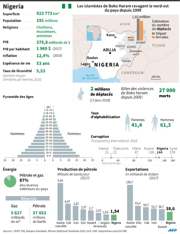 87 millions de Nigérians vivent dans l'extrême pauvreté et les chiffres s'aggravent de jour en jour, laissant augurer "une implosion socio-économique", dans ce pays de 190 millions d'habitants, qui devrait devenir le troisième pays le plus peuplé du monde en 2050. La situation sécuritaire s'y est aussi largement aggravée ces dernières années et de nombreuses régions du pays sont instables. Des explosions de mortiers ont d'ailleurs été entendues à Maiduguri, capitale de l'Etat du Borno, région sous le joug du groupe jihadiste Boko Haram, quelques heures précédents le scrutin. Un contingent de "plus de cinq cents" soldats tchadiens est entré vendredi au Nigeria pour "prêter main forte" à l'armée nigériane, a annoncé à l'AFP le porte-parole de l'armée tchadienne, le colonel Azem Bermendoa Agouna. Pour être élu dès le premier tour, le vainqueur devra obtenir, outre la majorité des suffrages exprimés, au moins 25% des voix dans les deux tiers des 36 Etats de la fédération auxquels s'ajoute le territoire de la capitale fédérale, Abuja. Sinon un second tour aura lieu dans une semaine. Aucune date n'a été donnée pour les résultats mais ils sont annoncés en général dans les 48 heures suivant le scrutin.