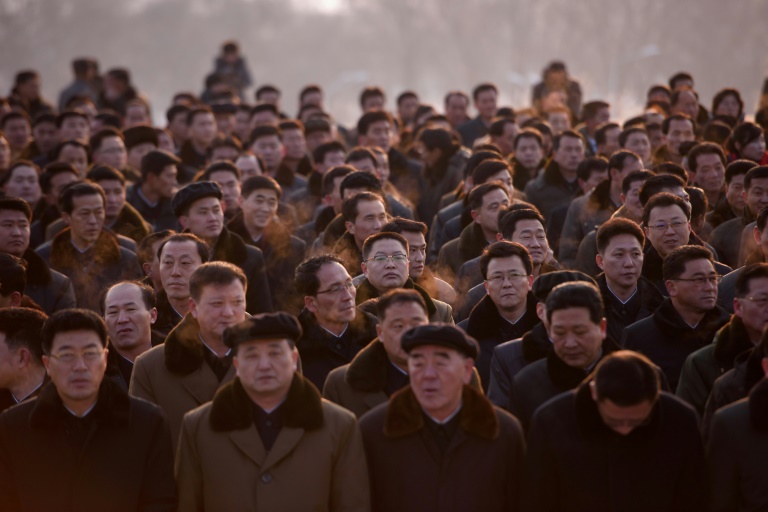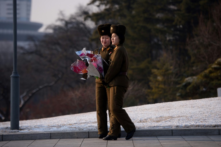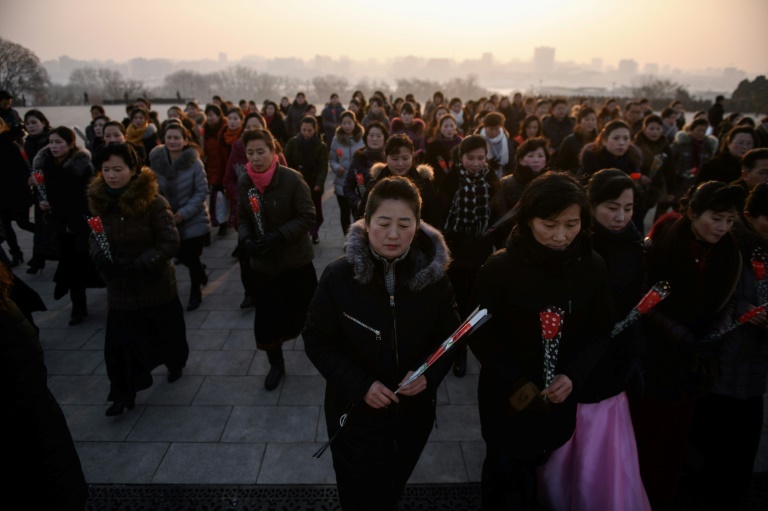 Des flocons parsemaient les deux panneaux monumentaux, l'un vantant la lutte contre l'occupant japonais, l'autre l'édification du socialisme, posés à côté des statues aux visages éclairés par le soleil levant, tandis que de jeunes enfants balayaient les marches menant à ce sanctuaire. Devant ces effigies était posée une immense composition florale au nom de Kim Jong Un, jeune chef de l'Etat qui doit retrouver le président américain Donald Trump fin février pour un sommet. La Corée du Nord est sous le coup de sévères sanctions internationales en raison de ses programmes d'armement nucléaire et balistiques, que Washington l'exhorte d'abandonner. Elle a rejeté ces exigences d'un désarmement "unilatéral".