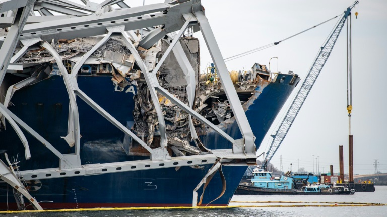 Le bateau, qui fait "presque la taille de la tour Eiffel" selon le gouverneur du Maryland Wes Moore, est désormais coincé sur place, avec une partie du pont effondré sur lui.