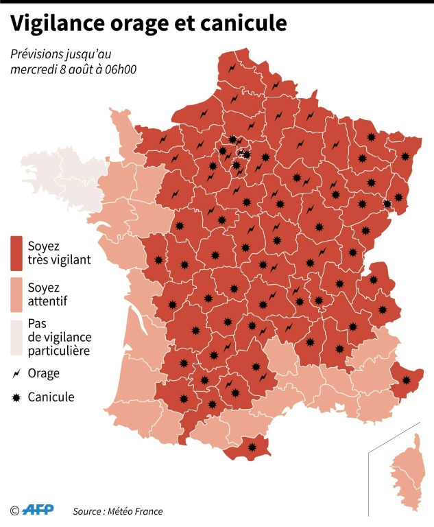 L'organisme a ainsi ramené à 50 le nombre de départements en vigilance orange, situés dans la moitié Est de la France: certains seulement pour la canicule (35), d'autres seulement pour les orages (4) et les derniers (11, situés entre les Ardennes et le Massif Central) pour les deux phénomènes.