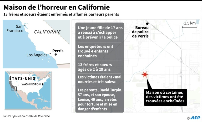 A leur arrivée, les agents du bureau du shérif de Perris, ville à environ 110 kilomètres au sud-est de Los Angeles, ont découvert trois enfants enchaînés, avec des cadenas, dans cette maison typique d'une banlieue américaine en apparence extérieure mais sordide et aux relents irrespirables à l'intérieur.
