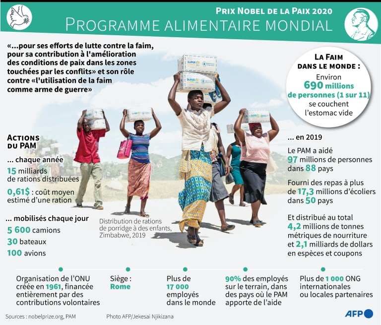 C'est depuis son siège à Rome que le PAM recevra à partir de 13H00 (12H00 GMT) le diplôme et la médaille Nobel qui lui ont été décernés le 9 octobre pour son combat contre la faim, souvent utilisée comme "arme de guerre" touchant en premier lieu les civils. Plus grande organisation humanitaire mondiale de lutte contre la faim, l'agence de l'ONU nourrit chaque année des dizaines de millions --97 millions l'an dernier-- de ventres affamés sur tous les continents. "Chacune des 690 millions de personnes souffrant de la faim dans le monde a aujourd'hui le droit de vivre en paix et sans avoir faim", répétait-elle cette semaine sur Twitter.