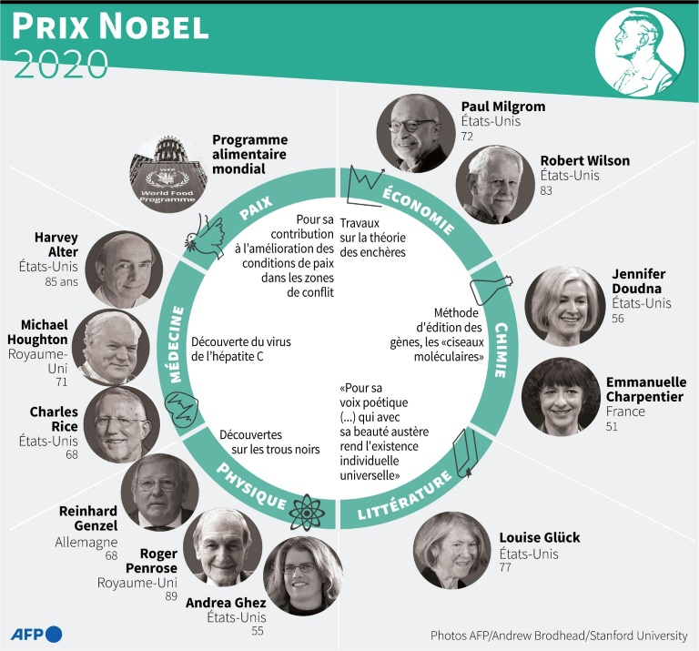 A Stockholm, les festivités sont aussi passées à la trappe, remplacées par des événements en grande partie pré-enregistrés. Après la poétesse américaine Louise Glück qui a reçu le Nobel de littérature dès dimanche à son domicile dans le Massachusetts, les autres prix ont été remis en ordre dispersé plus tôt cette semaine aux lauréats dans leurs pays de résidence respectifs. Co-lauréate du Nobel de chimie, la Française Emmanuelle Charpentier, notamment, a reçu la prestigieuse récompense lundi soir des mains de l'ambassadeur de Suède à Berlin, où elle travaille.