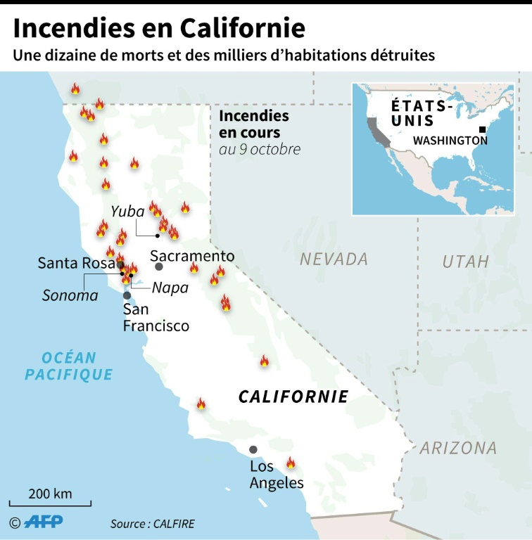 De violents incendies dans lesquels au moins 13 personnes ont péri selon un dernier bilan continuaient mardi de ravager la Californie et notamment ses régions viticoles au nord de San Francisco.