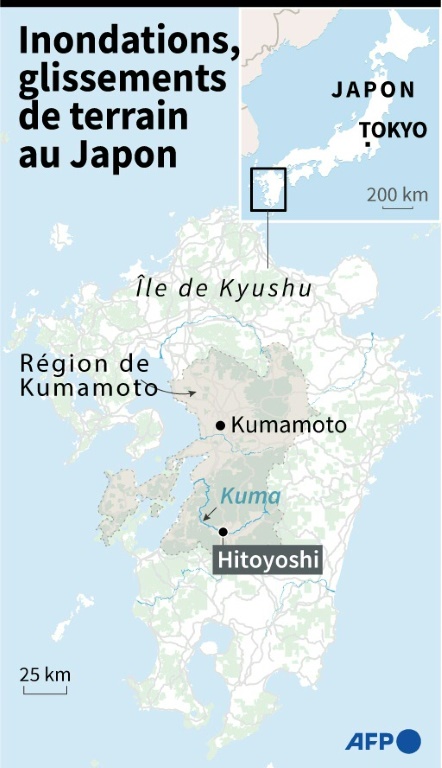 Dans un centre pour personnes âgées de la région de Kumamoto, 14 personnes sont présumées mortes noyées samedi en raison de l'inondation du rez-de-chaussée par une rivière en crue, des résidents en fauteuil roulant n'ayant pu se réfugier dans les étages supérieurs. Une cinquantaine de résidents et d'employés de cette maison de retraite médicalisée ont été secourus au moyen de canots de sauvetage.