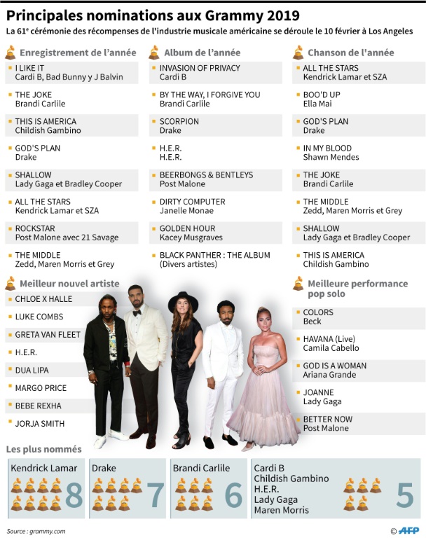 Pour la deuxième fois de suite, le hip-hop caracole en tête des nominations, avec huit sélections pour Kendrick Lamar, suivi de peu par son challenger canadien Drake. Mais de nombreux spécialistes attendent encore de voir si cela va réellement se traduire par des récompenses, car les organisateurs ont souvent été accusés de privilégier les artistes blancs et masculins.