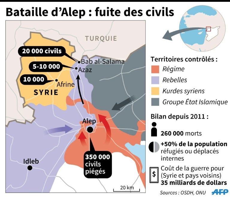 La Turquie continuait lundi à contenir à sa frontière les dizaines de milliers de civils qui ont fui les combats entre l'armée syrienne et les rebelles à Alep, en pleine visite d'Angela Merkel venue la presser d'en faire plus pour ralentir le flux des migrants vers l'Europe.