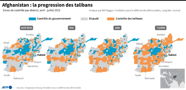 Les talibans ont affirmé vendredi qu'ils avaient pris le contrôle de 85% du territoire de l'Afghanistan, dont le plus important poste-frontière avec l'Iran, dans le cadre d'une offensive qu'ils mènent contre les forces de Kaboul alors que les Américains achèvent leur retrait du pays.
