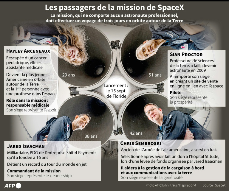 Le milliardaire Jared Isaacman, l'assistante médicale Hayley Arceneaux, l'ingénieur aéronautique Chris Sembroski et l'enseignante en sciences Sian Proctor tournent en orbite à 590 kilomètres d'altitude. Tous sont des novices de l'espace. La mission baptisée Inspiration4, qui tourne plus loin que la Station spatiale internationale (environ 400 km d'altitude) est la première à aller aussi loin dans l'espace depuis une mission de réparation du télescope Hubble en 2009.