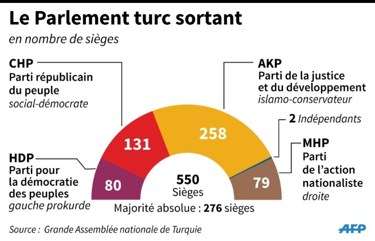 Son Parti de la justice et du développement (AKP) était arrivé en tête avec 40,6% des suffrages mais n'avait raflé que 258 sièges de députés sur 550, enterrant provisoirement son rêve de "superprésidence" aux prérogatives renforcées.