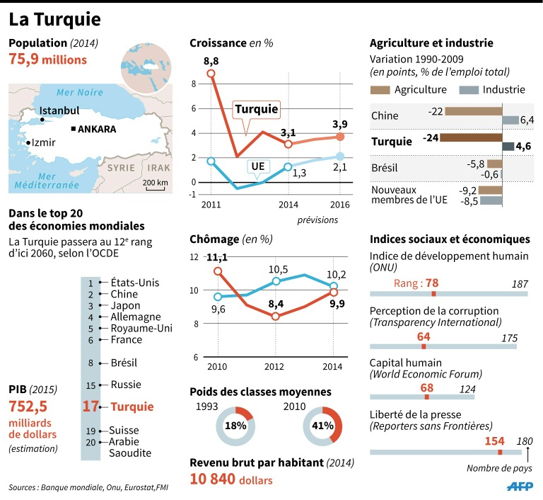 "Dimanche est un tournant pour notre pays", a averti M. Erdogan. "Si notre peuple se prononce pour le gouvernement d'un seul parti, alors la stabilité pourra continuer", a-t-il ajouté, "après ça j'espère que la +nouvelle Turquie+ ne revivra pas les difficultés qu'elle a connues au cours des cinq derniers mois".