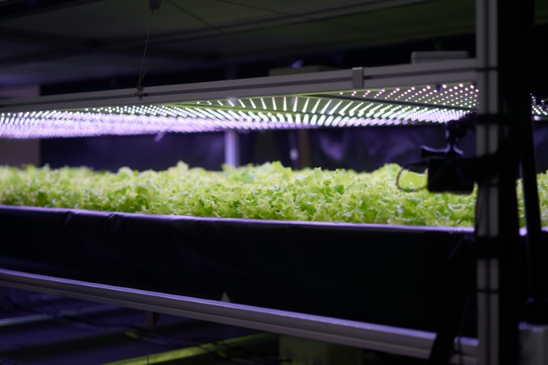 Cela ressemble à une installation d'art contemporain: dans le noir, sur des casiers métalliques étalés du sol au plafond, de petites pousses vertes éclairées d'un halo violet.