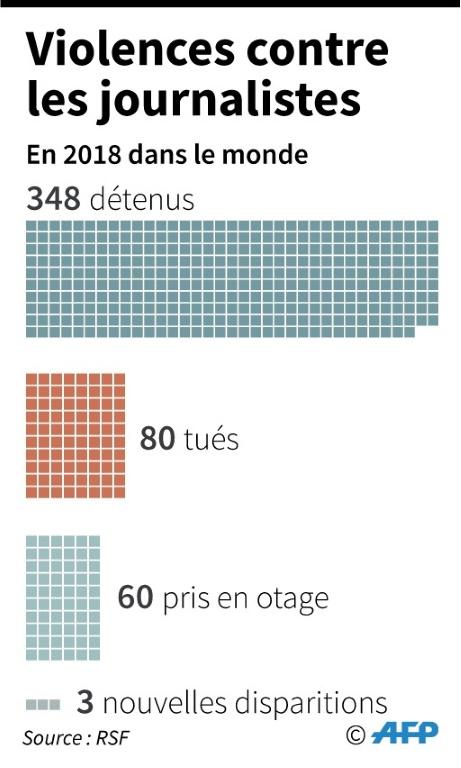 Après trois années de baisse, les violences contre les journalistes sont reparties à la hausse en 2018, avec 80 journalistes tués à travers le monde, selon le bilan annuel de Reporters sans frontières (RSF) publié mardi. L'an dernier, 65 journalistes avaient été tués pour avoir exercer leur mission d'information.