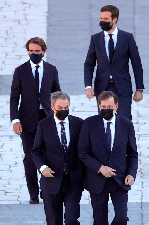 Sous un grand soleil, devant le Palais royal de Madrid, cette cérémonie était présidée par le roi Felipe VI et rassemblait les plus hautes autorités de l'Etat espagnol et des dirigeants de l'UE et d'organisations internationales, tous masqués et assis sur des chaises espacées pour respecter les distances de sécurité.