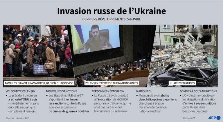 La vice-Première ministre Iryna Verechtchouk a également lancé depuis Kiev mercredi un appel aux habitants de l'est du pays à évacuer la région "immédiatement", en raison des craintes d'une offensive majeure de l'armée russe sur le Donbass (est) dont la Russie a désormais fait sa cible numéro un.