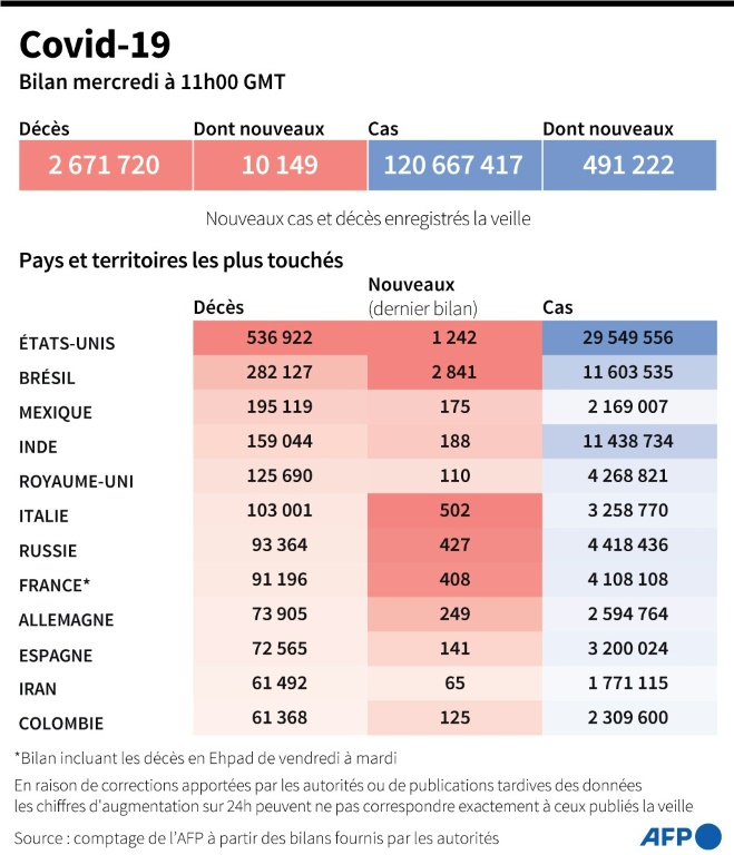En Italie, une cérémonie en hommage aux plus de 103.000 morts du coronavirus aura lieu jeudi à Bergame (nord) en présence du chef du gouvernement Mario Draghi. Confrontées à une dégradation de la situation sanitaire, les Philippines vont fermer temporairement leurs frontières aux étrangers et réduire le nombre de leurs ressortissants autorisés à entrer dans le pays, en raison d'une recrudescence des contaminations dans l'archipel.