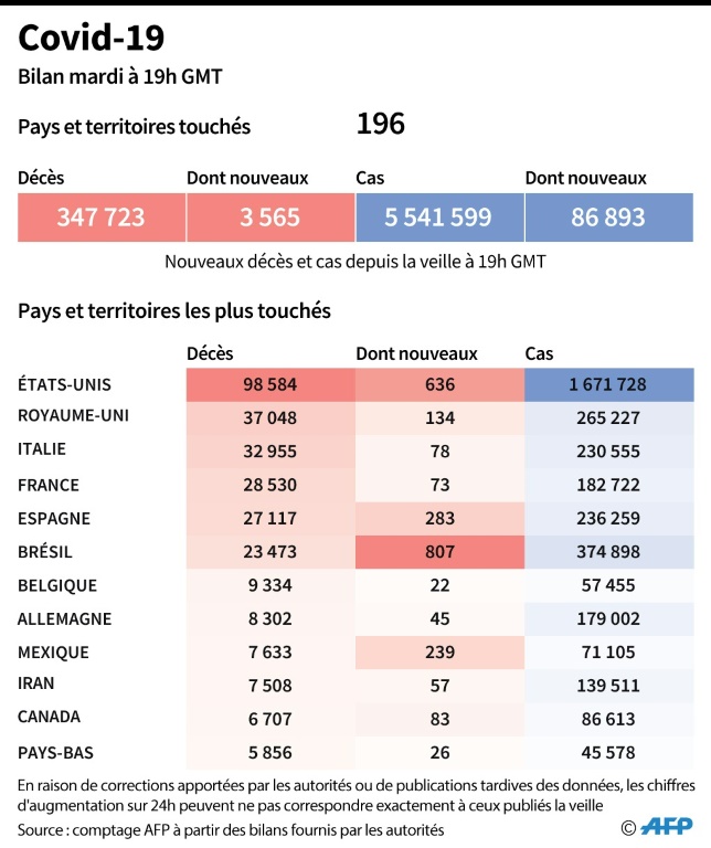 Un pari à mille milliards d'euros: la Commission européenne précise mercredi son plan pour relancer les économies des 27 éprouvées par la pandémie qui a fait au moins 347.723 morts depuis son apparition en Chine en décembre. Et si la situation semble se stabiliser en Europe, l'épidémie continue à faire des ravages en Amérique du Sud.