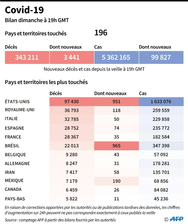 L'Europe, où plus de 173.000 personnes ont été tuées par le coronavirus, poursuit avec prudence son retour à la normale, tandis que les Etats-Unis frôlent les 100.000 morts et que plus de 40.000 personnes ont péri en Amérique latine et dans les Caraïbes.