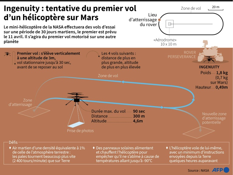 Il ne doit durer que 40 petites secondes mais n'en sera pas moins historique: le premier vol d'un engin motorisé sur une autre planète, qui avait été repoussé, pourrait finalement être tenté lundi par Ingenuity, l'hélicoptère de la Nasa, sur Mars.
