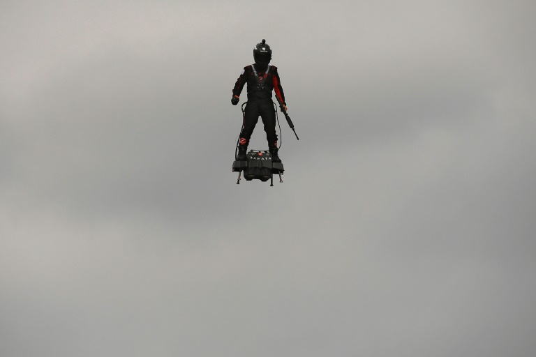 Le "Flyboard", une machine volante autonome alimentée en kérosène stocké dans son sac à dos, est doté de cinq mini-turboréacteurs qui lui permettent de décoller et d'évoluer jusqu'à 190 km/h debout dans les airs, avec une autonomie d'une dizaine de minutes.