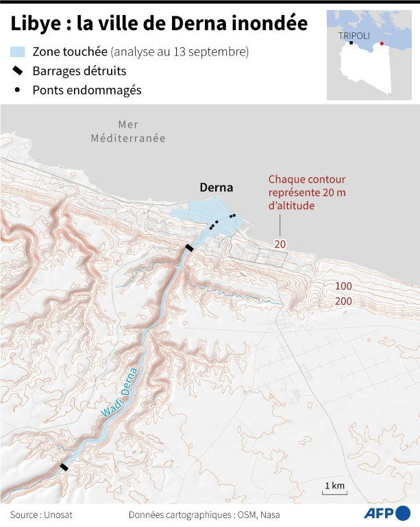 Selon un photographe de l'AFP sur place, le centre ville de Derna ressemble désormais à un terrain aplati par un rouleau compresseur. Les arbres ont été déracinés, les immeubles et les ponts détruits.