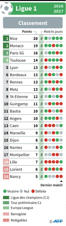 L'inattendu leader est encore sous la menace de Monaco, à un point. L'ASM, qui reste sur un carton à Metz (7-0) et compte trois points d'avance sur le Paris SG, doit faire au moins un match nul pour être sûr de conserver sa place de dauphin. Monaco ira défier le CSKA Moscou mardi en C1.